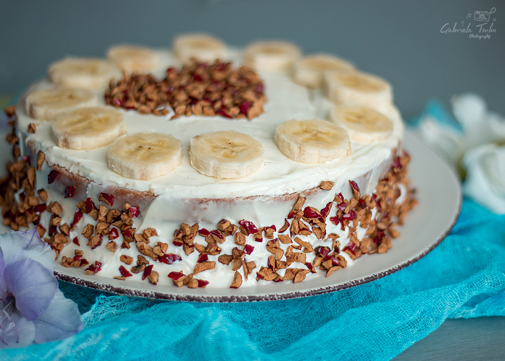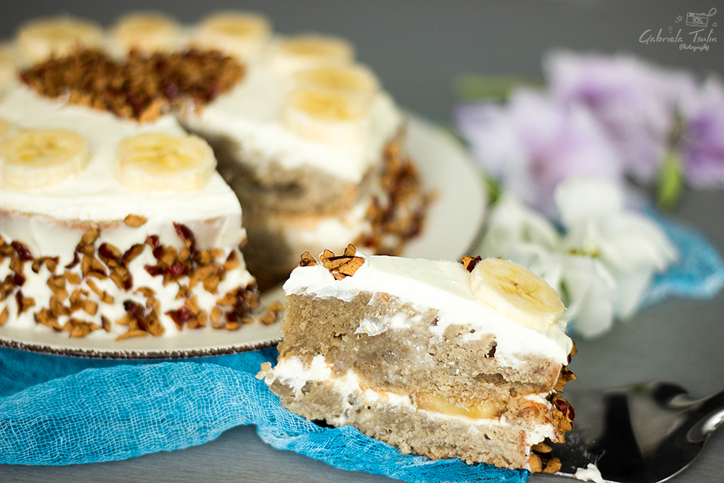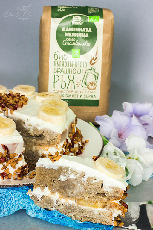 За приготвянето на тортата съм използвала пълнозърнесто брашно от ръж, смляно в каменна мелница. Поради тази причина блата се получава една идея по сбит и по влажен. При използването на бяло брашно се получава по – пухкав. Влияние за сбитостта оказват и бананите.