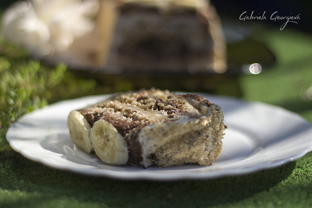 За тортата използвах големи бисквити, които се оказаха най – подходящи за тавичката. Използвах много малко захар, като повече разчитах на сладостта на бананите. Използвах и най – новата захар с аромат на ром, която майка ми си беше купила. Оказа се изключително ароматна. Останах очарована от аромата, който предаде на тортата. Получи се и доста сочна, защото топих бисквитите в гореща вода. Като стана въпрос за това, препоръчвам ви да ги топите за секунди, както направих аз, защото иначе рискувате да се разпадат парчетата от мекота.