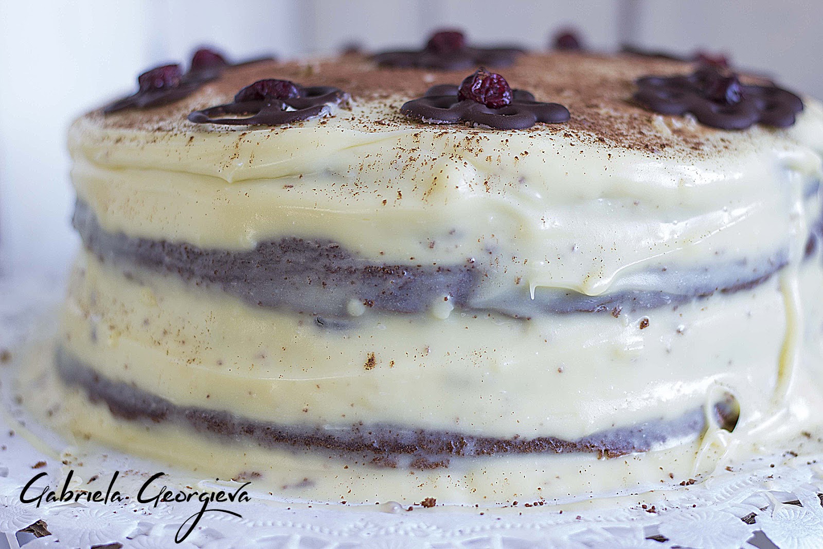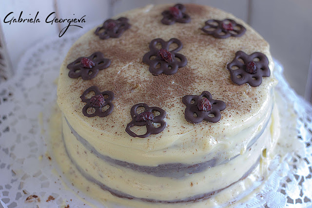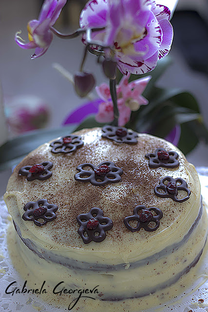 Поръсете тортата с какао на прах, а отгоре подредете готовите цветчета.