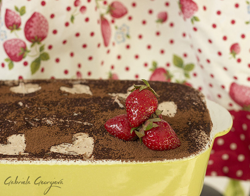 Наредете ред бисквити в правоъгълна тава, отгоре разпределете от сметаново – шоколадовата смес, след това наредете още един ред бисквити и така докато сместа и бисквитите свършат. Поръсете с какао и декорирайте с ягоди или други сезонни плодове по избор. Прибирате в хладилник за едно денонощие.