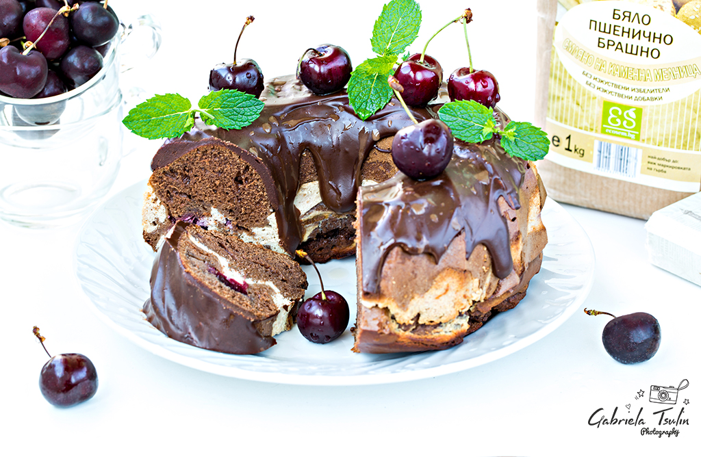Обезкостете черешите и ги разпределете върху шоколадовата смес, полейте с млечната смес, а върху млечната разпределете останалата шоколадова смес.