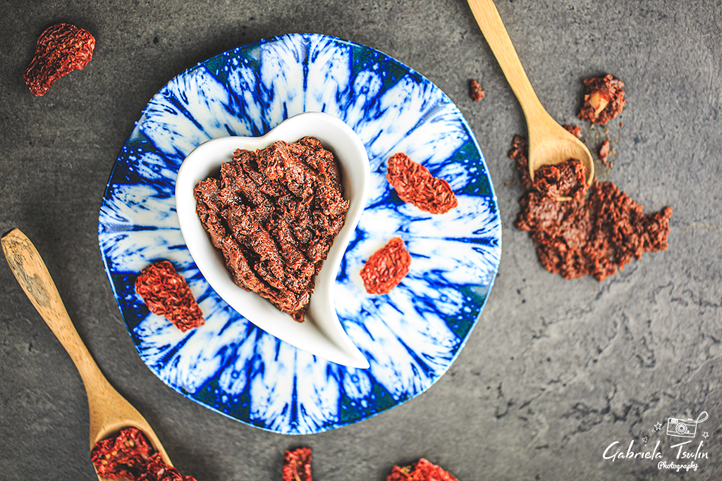 Използвах сушени домати сорт „Рома“, които са характерни с това, че не съдържат много вода, т.е. по – сухи са и в същото време много сладки!