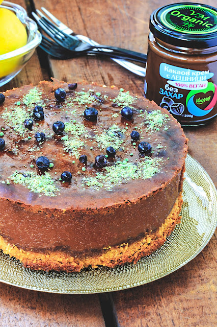 За приготвянето на рецептата използвах един нов продукт за мен – веган течен шоколад с лешници, без захар VikiNuts . От VikiNuts ми го изпратиха за тест и аз реших да го тествам в десерт. А ето го и него – чийзкейк.