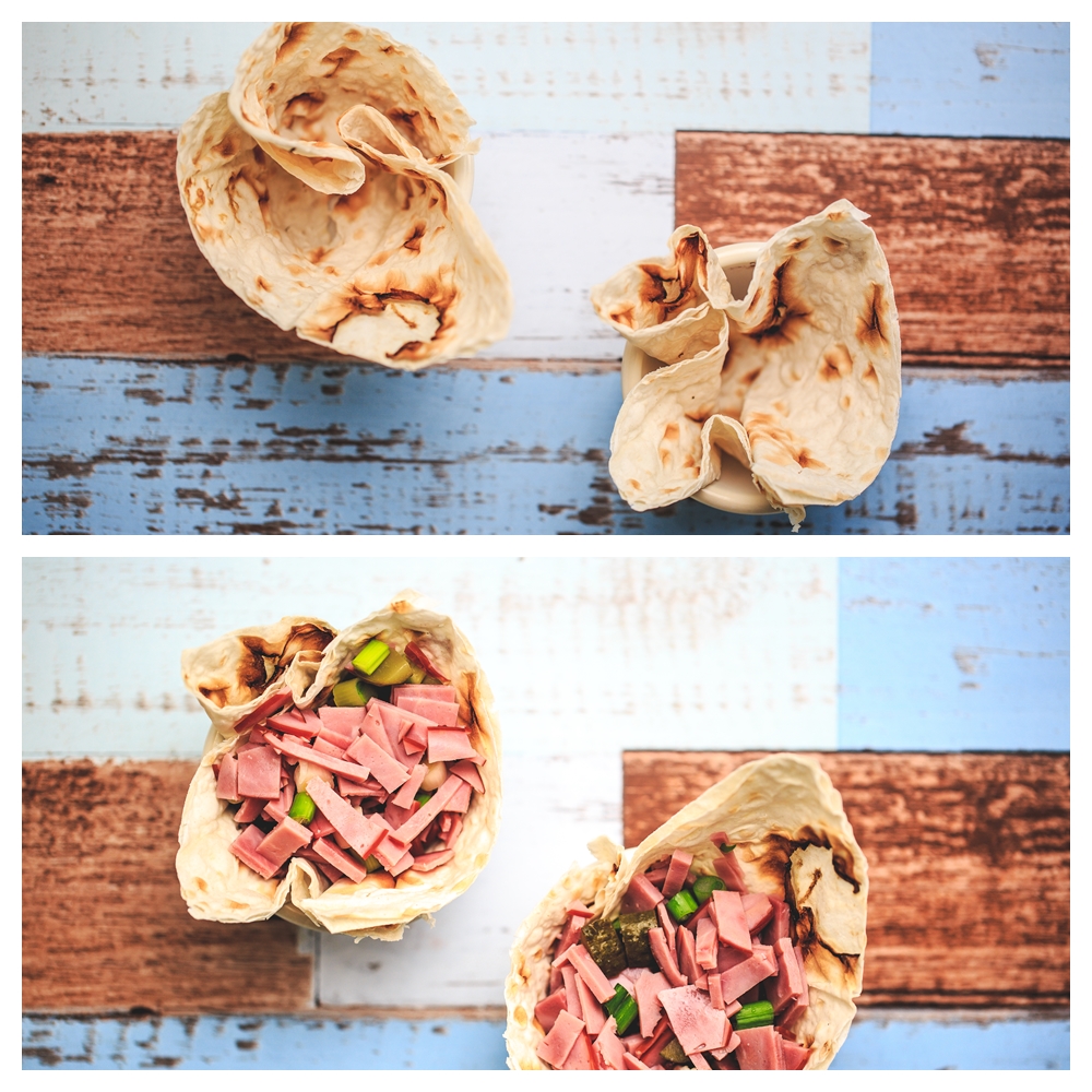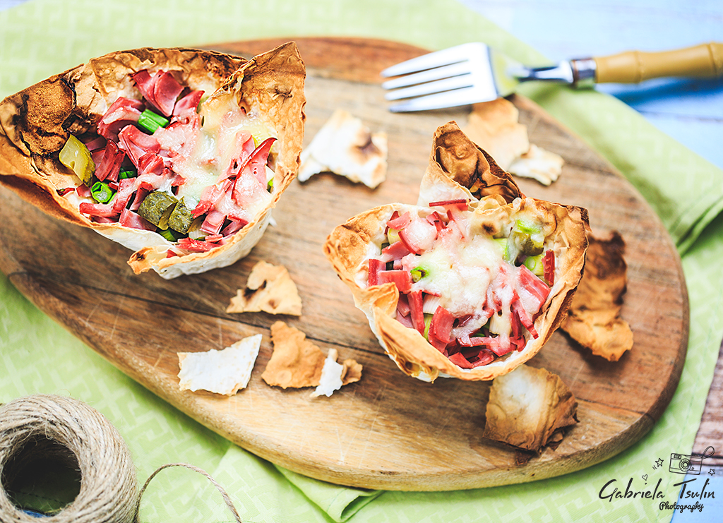 Разрежете корите лаваш така, че да се образуват по – малки кръгчета.