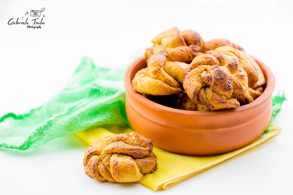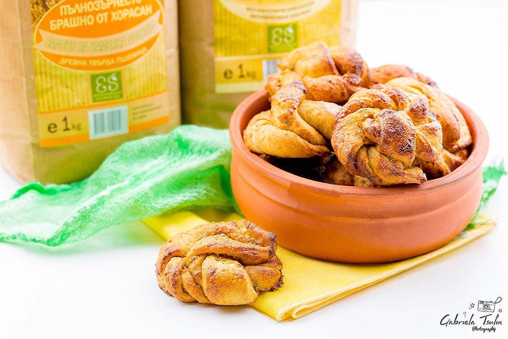 Много исках да приготвя плънка от тахан халва и краве масло – нещо, което никога не съм приготвяла. Реших да направя подобни на Козуначените кълбета, като този път тестото не е козуначено. Използвах един нов вид брашно за мен – брашно от хоросан, смляно в каменна мелница.