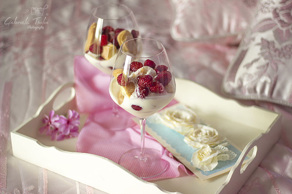 Този лек десерт с кисело мляко е едно малко изкушение ако сте любители на леките и свежи кремове. Приготвя се много бързо и е подходящ дори за неочаквани гости. Аз го приготвих около час преди консумация и бишкотите бяха почти омекнали. Имаше и хрупкава част – тази, която не бе покрита с мляко. Малините все още не са много сладки, затова ако сте любители на много сладки десерти, може да увеличите количеството мед. Използвах домашно кисело мляко, което е почти като цедено мляко.