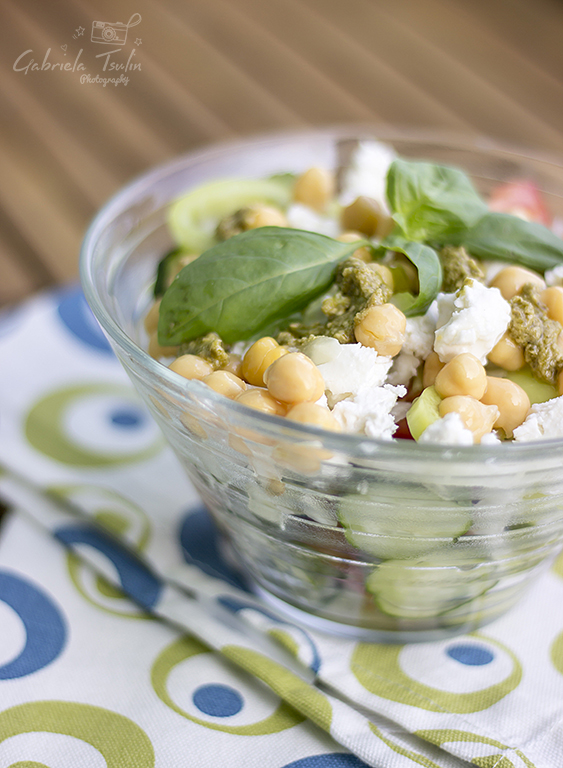 Поръсете с натрошено сирене, босилеково песто и нахут.