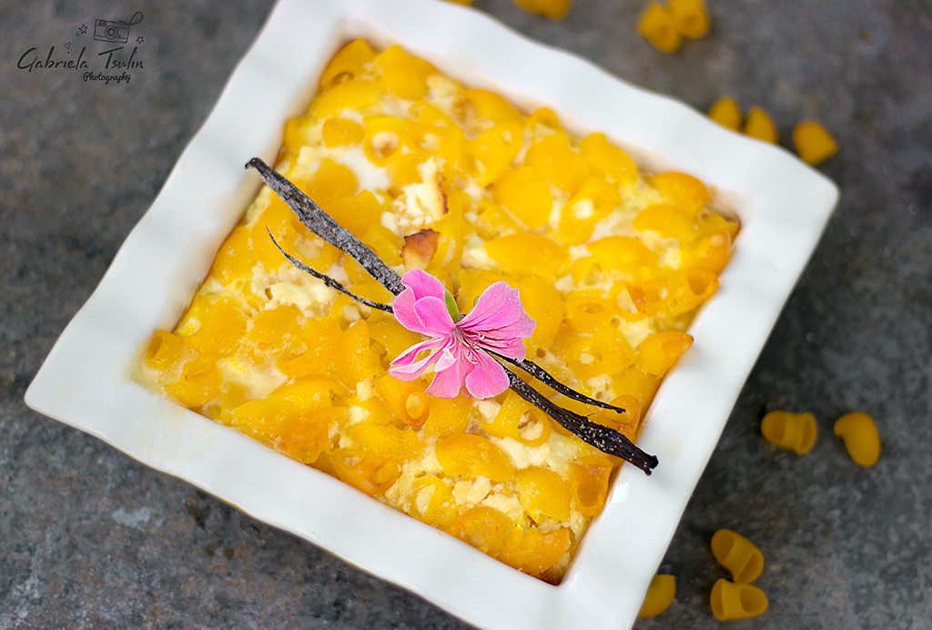 Сложете макароните в купа и добавете натрошеното сирене, вътрешността от шушулката ванилия, стевията и сместа с млякото.