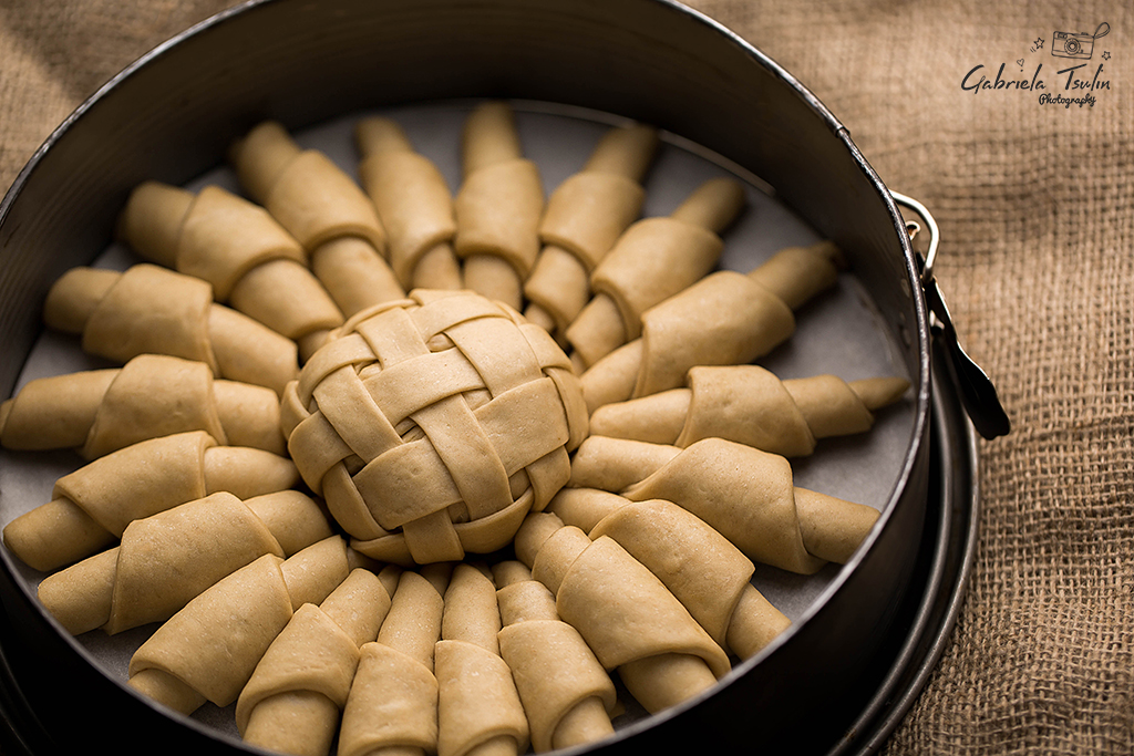 Навийте кифлички и ги подредете в тавата, върху хартия за печене.