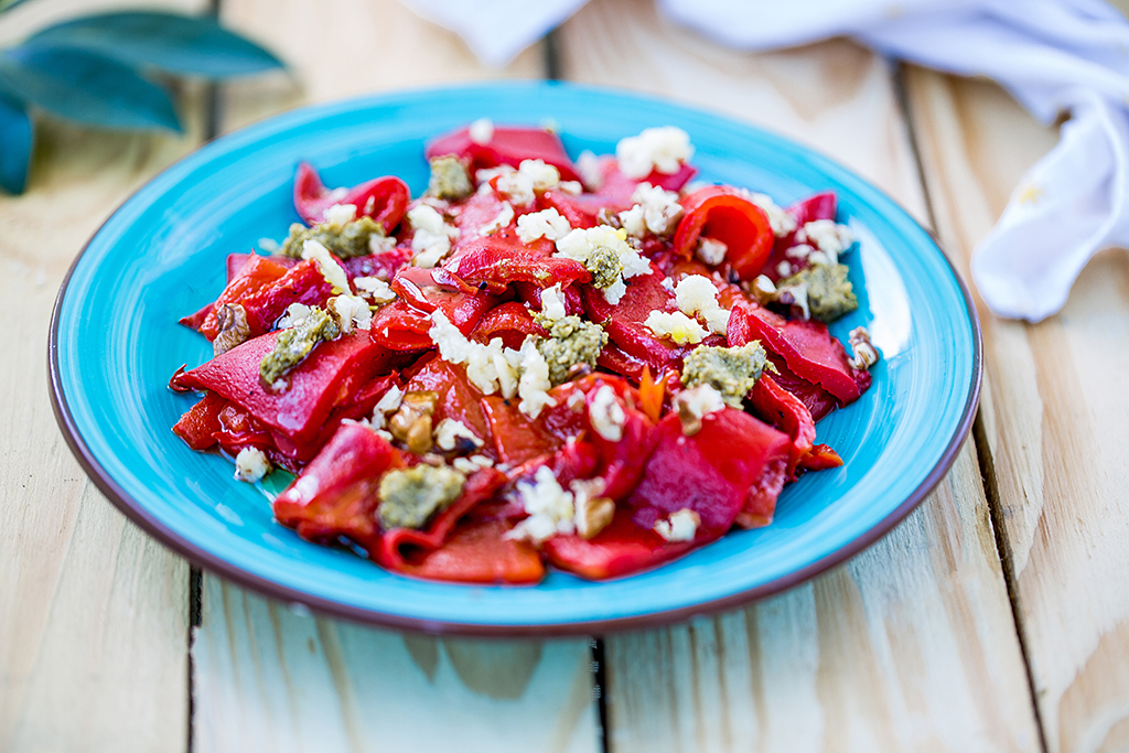 Сложете печените пиперки в чиния, поръсете ги с босилеково песто, запачени орехи, смлян чесън, зехтин, балсамов оцет, черен пипер и сол на вкус.