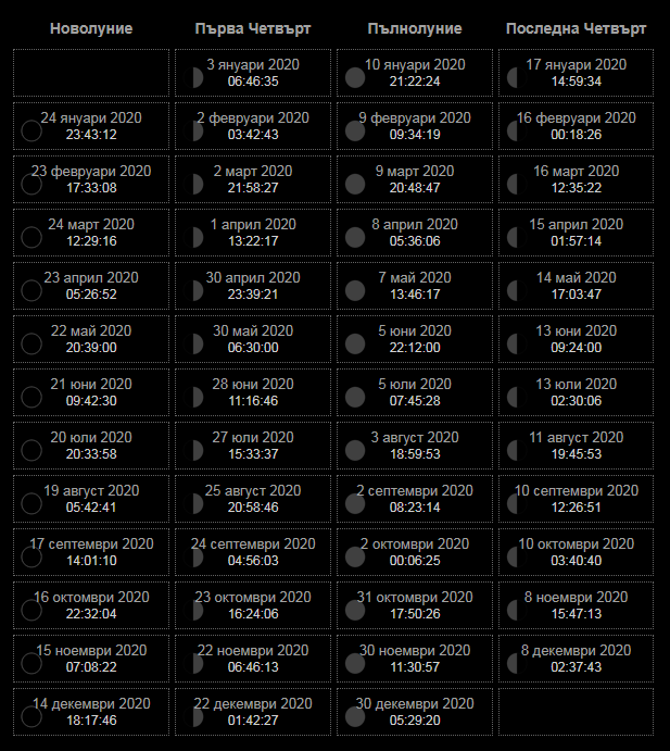 Ако решите да приложите периодично гладуване, можете да го съобразявате и с фазите на луната. Това е календар с лунните фази за 2020 година.