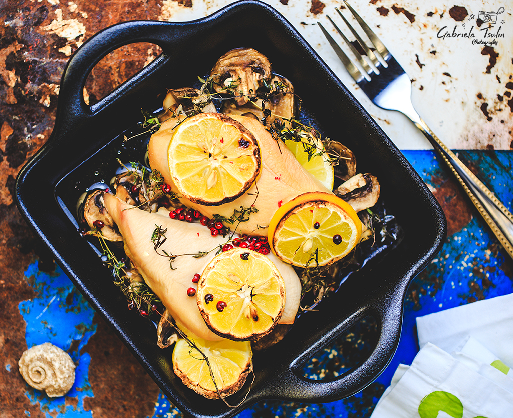 Полейте обилно със зехтин, а отгоре подредете резени лимон.