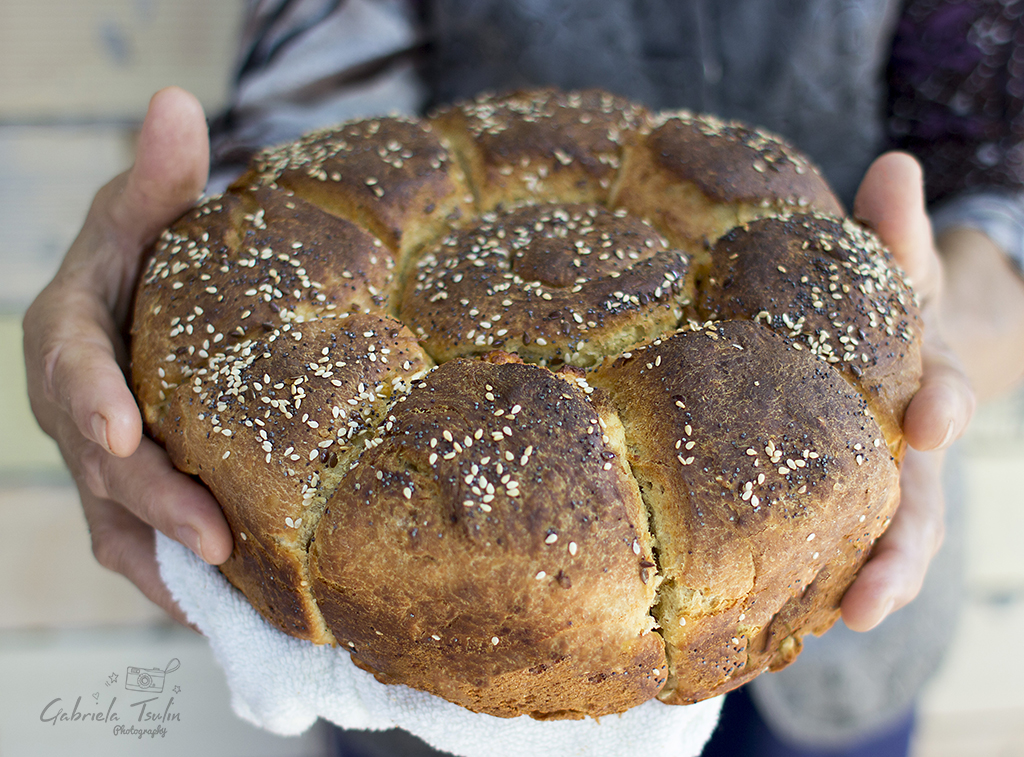 След като втаса повторно, намажете с масло и поръсете със семена.