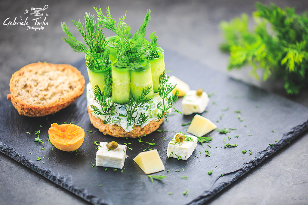 От посочените продукти излизат четири порции, като трябва да увеличите количеството краставица за декорацията.