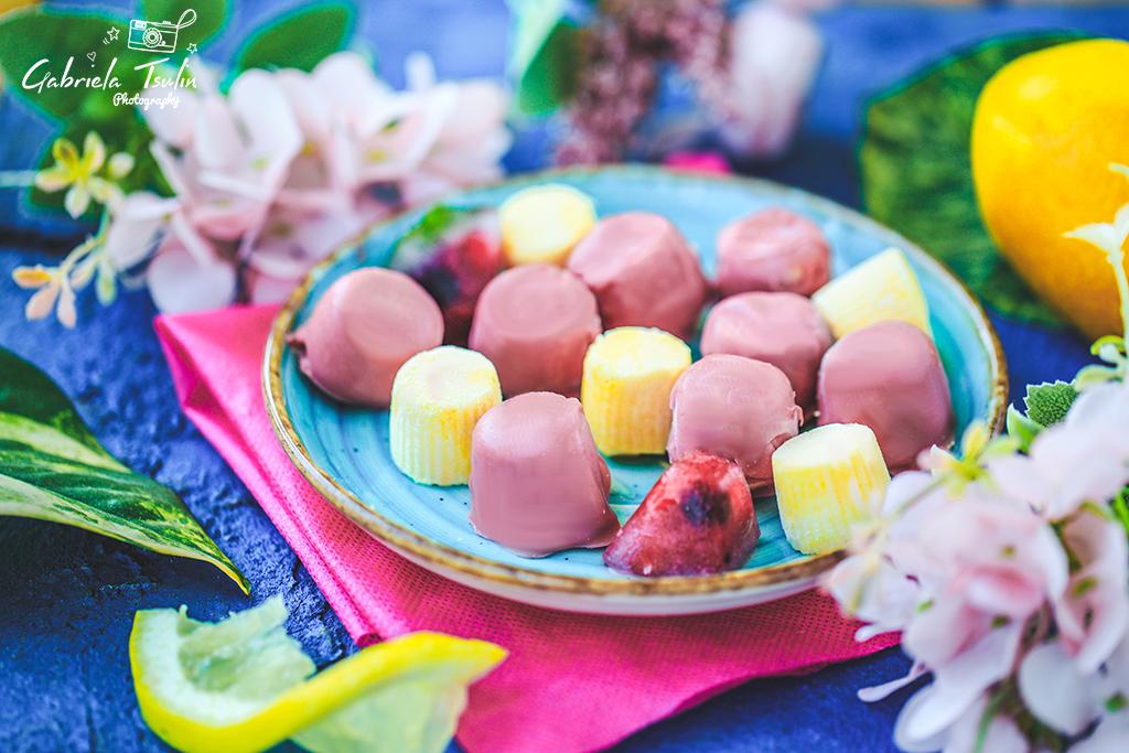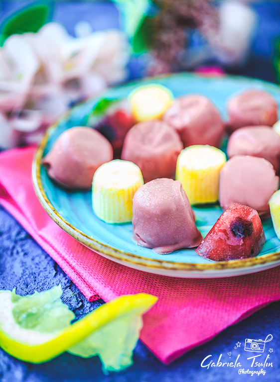 Покрих сладоледените лимонови бонбони с белгийски шоколад на капки, за да ги направя още по – цветни и интересни за нея.