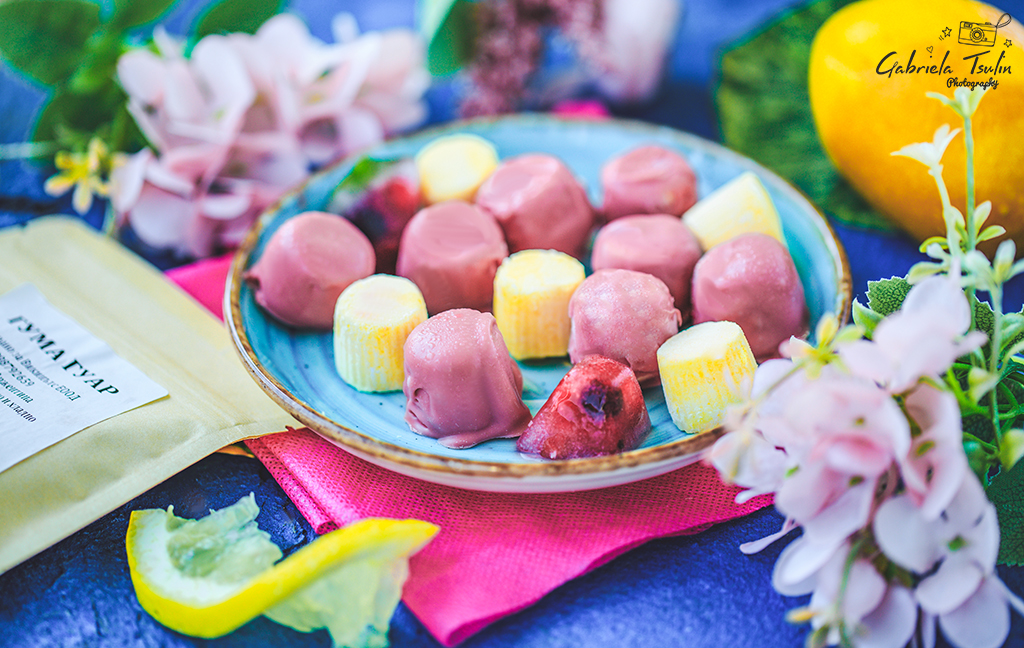 С него бонбоните имат хрупкава коричка, а под нея се крие ледена сърцевина от хрупкав и в същото време топящ се в устата, лимонов кърд.