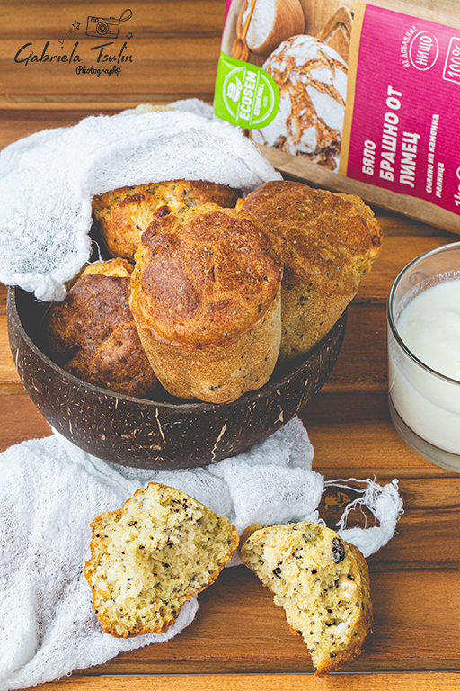 При приготвянето на тези мъфини използвам почти винаги бяло брашно от лимец, което се получава от едрозърнест лимец, които се отглежда от екосем в Дунавската равнина. Брашното е бяло с леко жълтеникъв цвят. В комбинация със семолата (вид брашно), се получават жълтеникави мъфини с бели частици (от сирене) и черни точици (от чията). Ако ви спечелих – прочетете по – долу рецептата. Ще се радвам ако я тествате, да споделите с мен резултата.