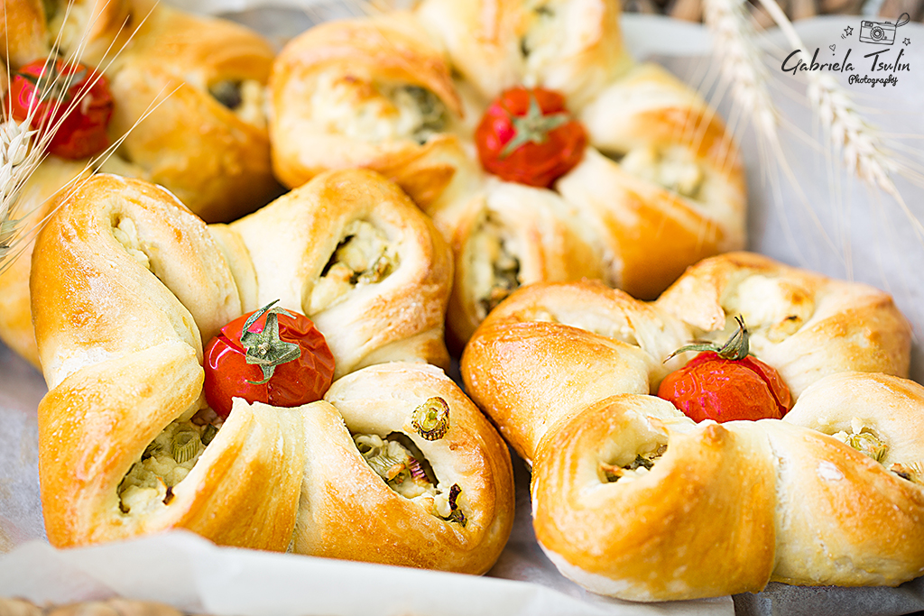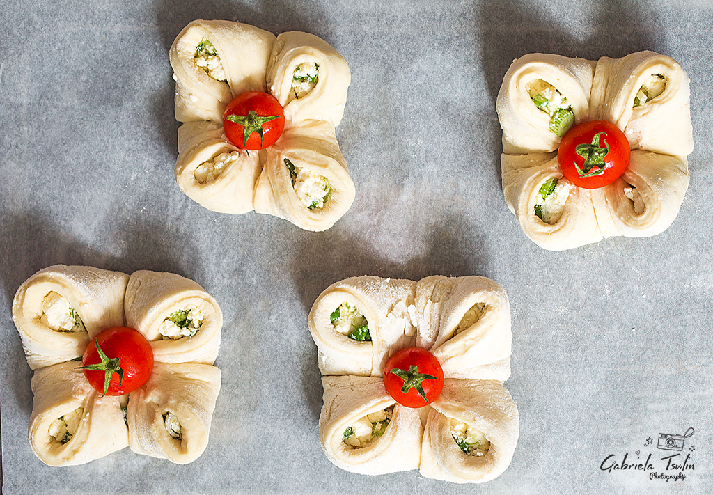 Трябва да получите цвете от тесто, като по средата на всяко цвете остава по един празен участък в който ще сложим чери доматче.