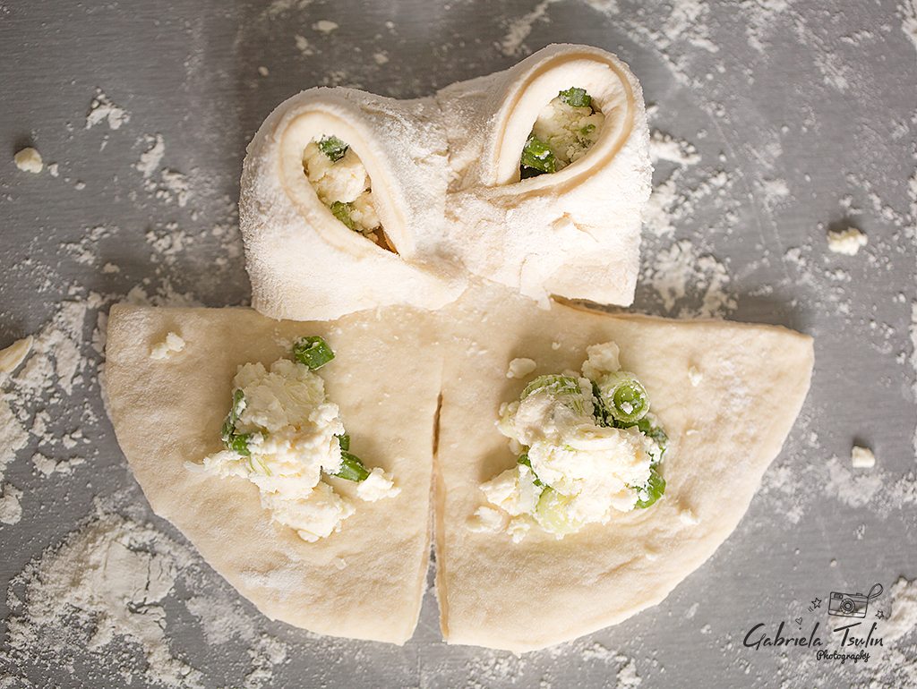 Сложете плънка от козе сирене и пресен лук във всеки един образувал се участък.