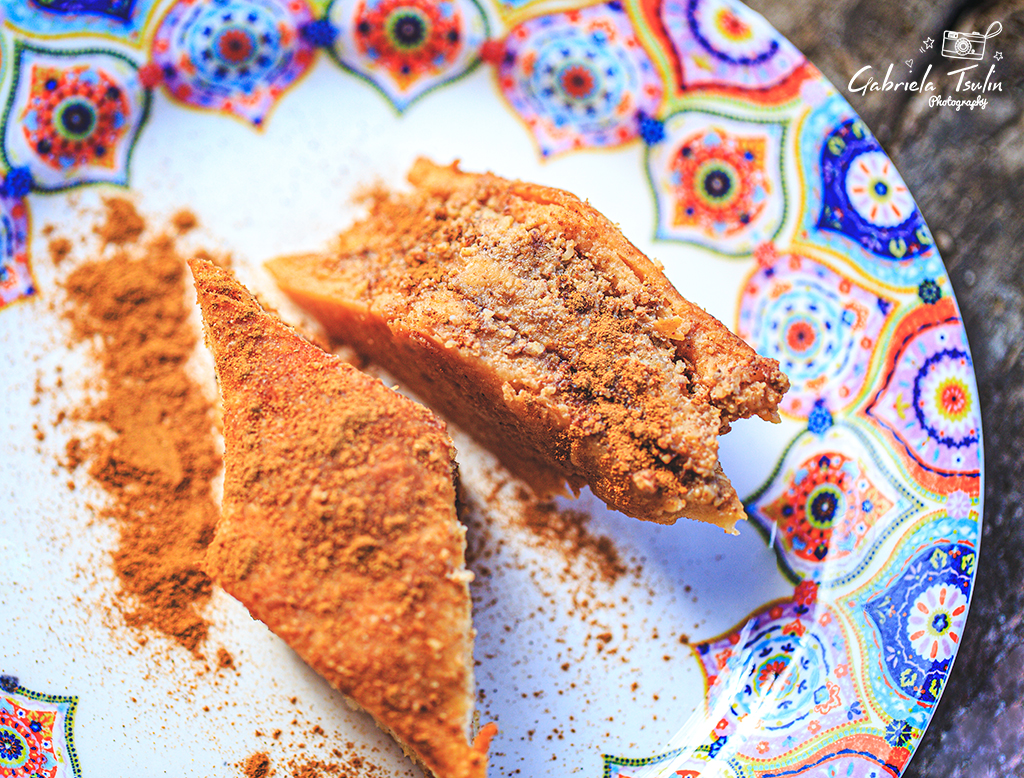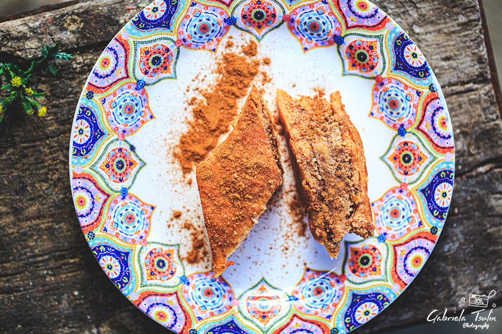 Сложете един лист в подходяща тава, която предварително сте намазали със зехтин или кокосово масло. Поръсете с плънка.