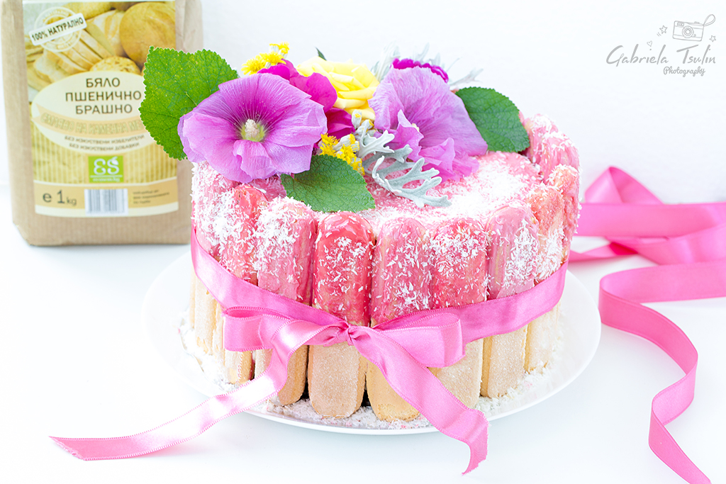 Би трябвало да ви остане малка част розов шоколад. Залейте тортата отгоре с него и загладете. Поръсете с кокосови стърготини.