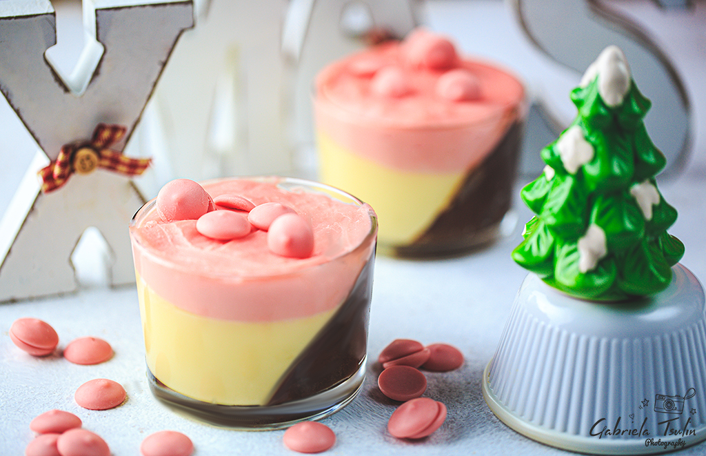Разбъркайте добре и разсипете в две десертни чашки, които трябва да сложите в други чашки – под наклон.