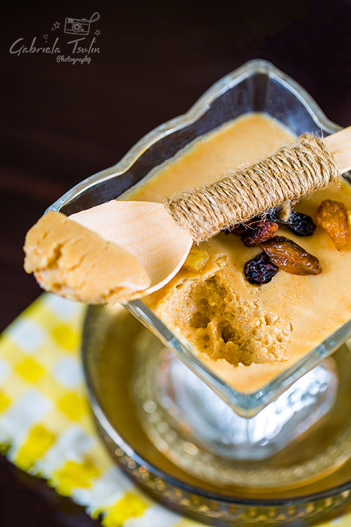 Приготвя се много лесно – елементарен е. Получава се пухкава и гладка консистенция. Отгоре ръся понякога по нещо. В този случай – стафиди, портокалови корички и френско грозде. Радост си обира и похапва първо сушените продчета, а след това кремчето. Понякога слагам натрошени бисквити или нарязани на ситно смокини. Всеки път е различно.